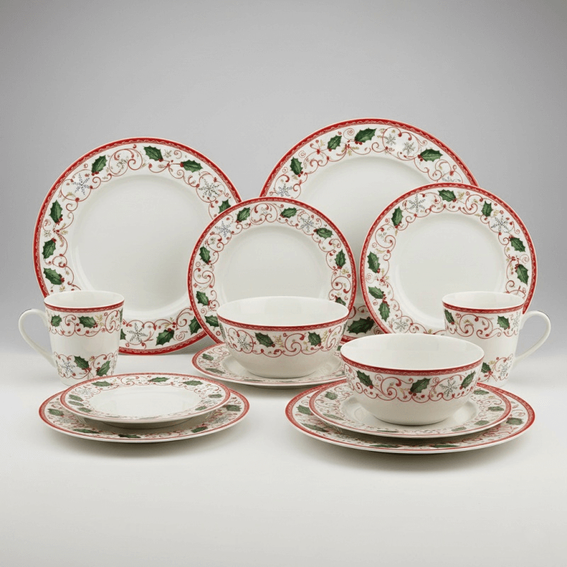 Premium porcelain featuring hand-painted snowflakes, holly berries, and festive red-green color schemes that capture authentic holiday warmth. Complete 16-piece sets include dinner plates, salad plates, bowls, and mugs designed for family gathering excellence.