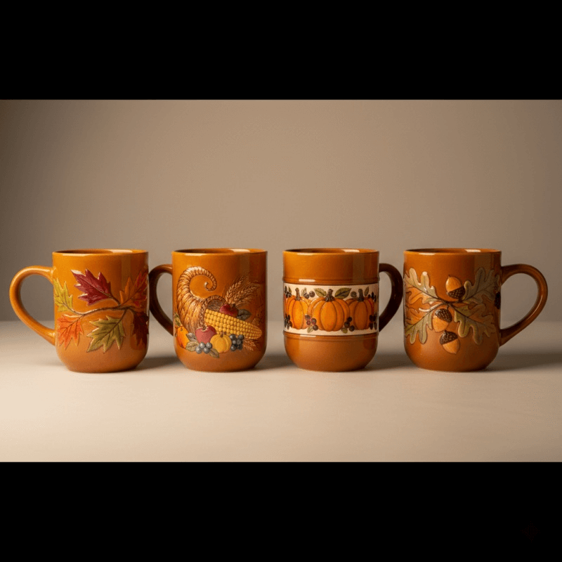 Oversized ceramic mugs featuring harvest themes with autumn leaves, cornucopia designs, and rich amber-brown color palettes. Heat-retaining properties keep beverages warm during long family gatherings while adding seasonal charm to every table setting.