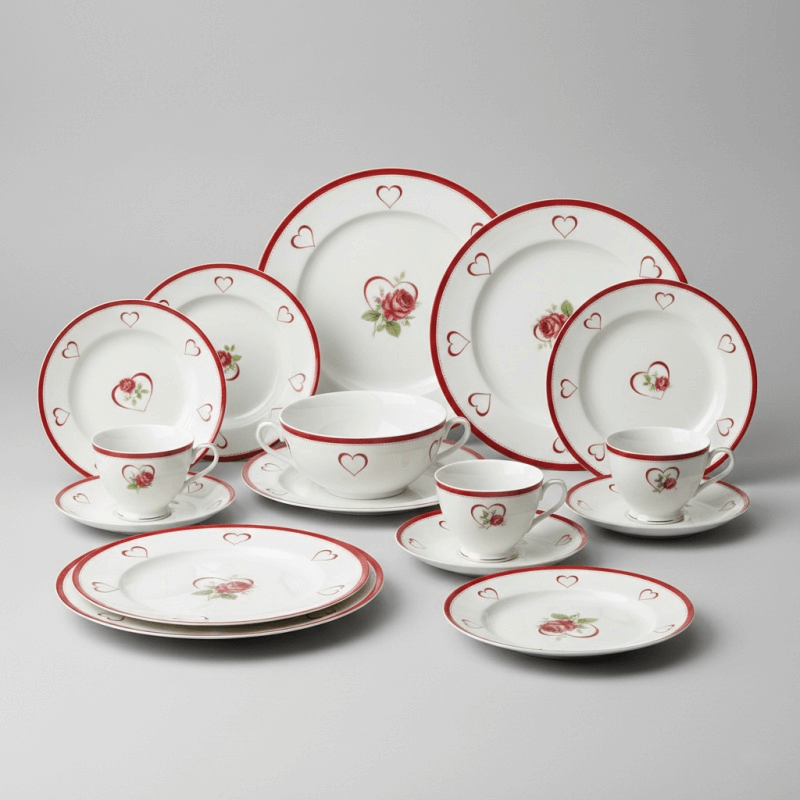 Elegant fine china adorned with subtle heart motifs, romantic rose patterns, and sophisticated red-white combinations. Perfect for intimate dinners and gift retail, offering couples memorable dining experiences that celebrate love tastefully.